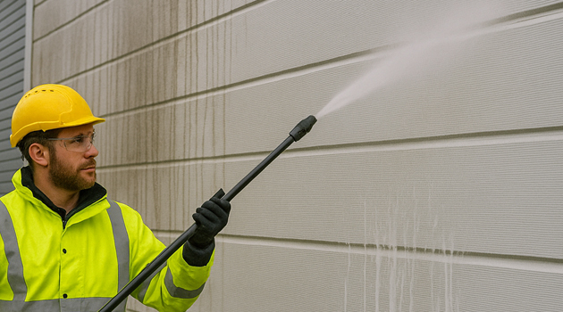 - Soft-wash pre-treatment to lift biological growth and traffic film